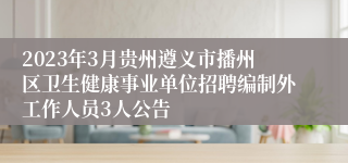 本次公开招聘编制外工作人员3名,具体招聘岗位及要求见《遵义市播州区卫生健康事业单位2023年3月公开招聘编制外工作人员一览表》(附件)。