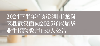 龙岗区2024年下半年将赴武汉面向2025年应届毕业生公开招聘公办中小学教师150名,招聘岗位见《深圳市龙岗区2024年下半年赴武汉面向2025年应届毕业生公开招聘教师岗位表》(附件1,以下简称《招聘岗位表》)。根据《中共中央组织部 人力资源社会保障部关于进一步做好事业单位公开招聘工作的通知》(人社部发〔2024〕57号)、《事业单位人事管理条例》(国务院令第652号)、《广东省事业单位公开招聘人员办法》(广东省人民政府令第301号)及深圳市事业单位管理有关规定,现就招聘事项公告如下:
