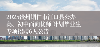 公务员考试网为各位考生带来:2025贵州铜仁市江口县公办高、初中面向优师 计划毕业生专项招聘6人公告。 考生还可以关注本栏目了解更多贵州教师招聘考试精彩内容。