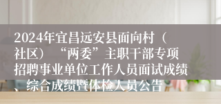 公务员考试网为各位考生带来:2024年宜昌远安县面向村(社区) “两委”主职干部专项招聘事业单位工作人员面试成绩、综合成绩暨体检人员公告。 考生还可以关注本栏目了解更多湖北事业单位考试精彩内容。