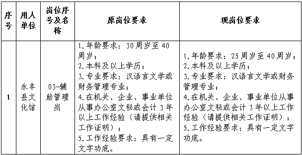 按照《2025年永丰县文化广电旅游局下属单位面向社会公开招聘编外工作人员公告》的要求,招聘小组已于2025年9月16日完成线上资格初审工作。根据最终报名初审情况,经永丰县文化广电旅游局下属单位招聘领导小组研究讨论决定将03-辅助管理岗做如下调整,现将岗位调整及01-讲解员岗线下资格审查相关事项公告如下: