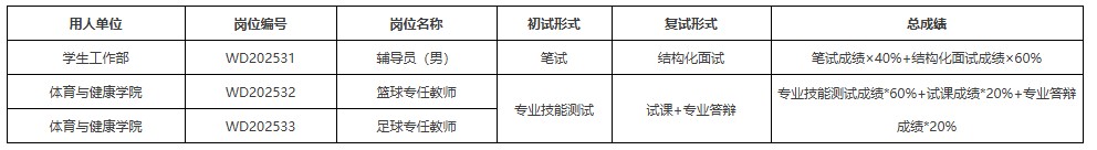 辅导员(男)岗位初试采用笔试的方式组织,采用百分制。根据应聘人员的初试成绩,从高分到低分,按1:5的比例确定入围资格复审和复试人员,如遇最后一名同分的,则一并进入资格复审和复试。