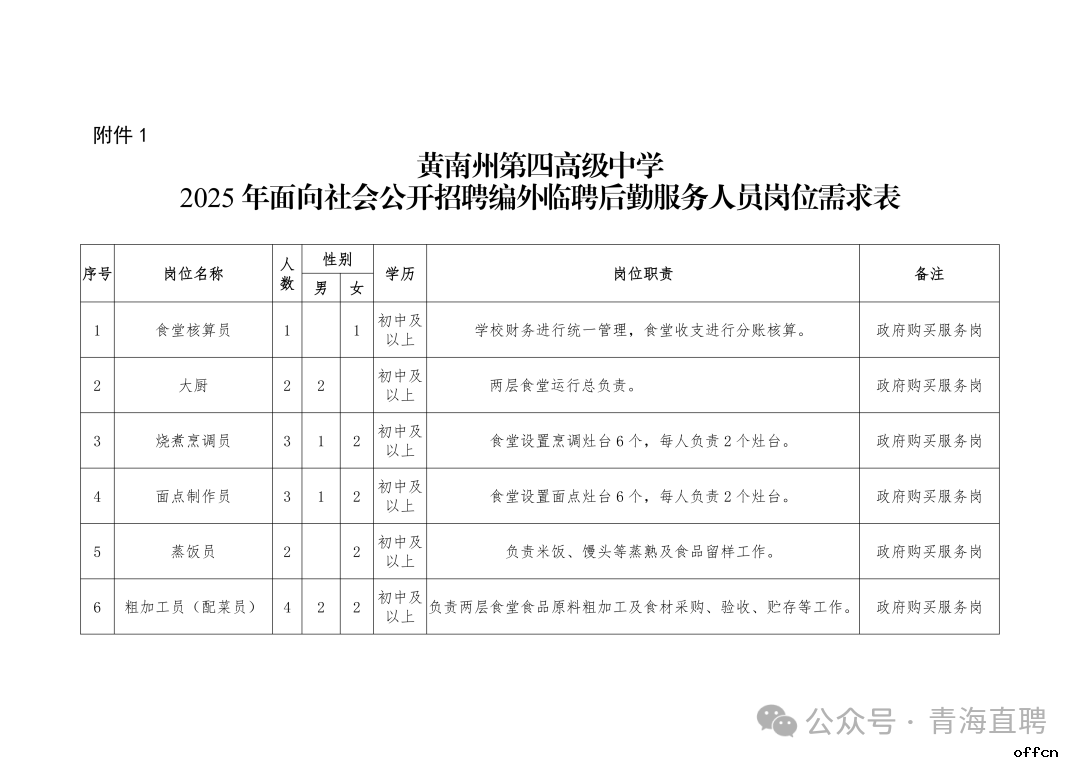 原文标题:黄南州第四高级中学2025年面向社会公开招聘编外后勤服务人员公告