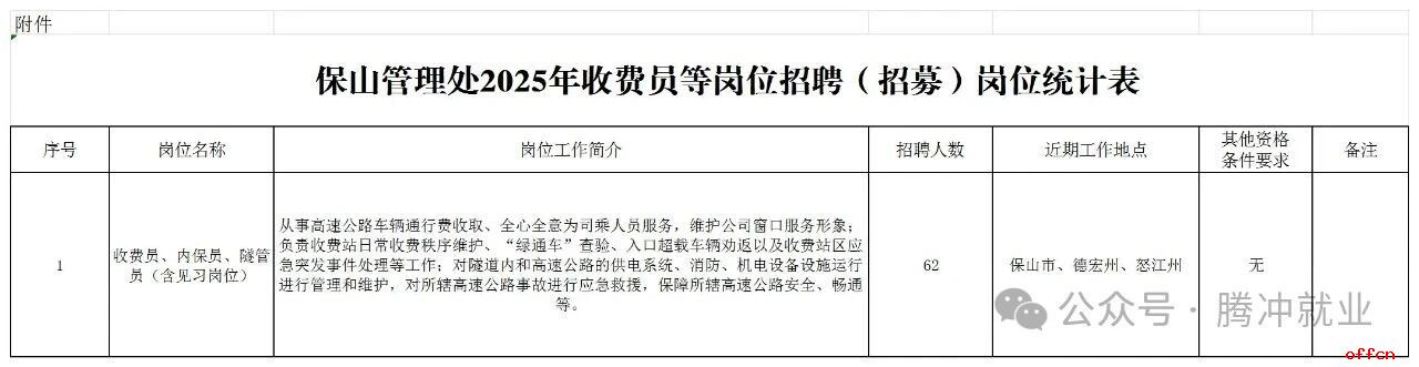 附件:保山管理处2025年收费员等岗位招聘(招募)岗位统计表