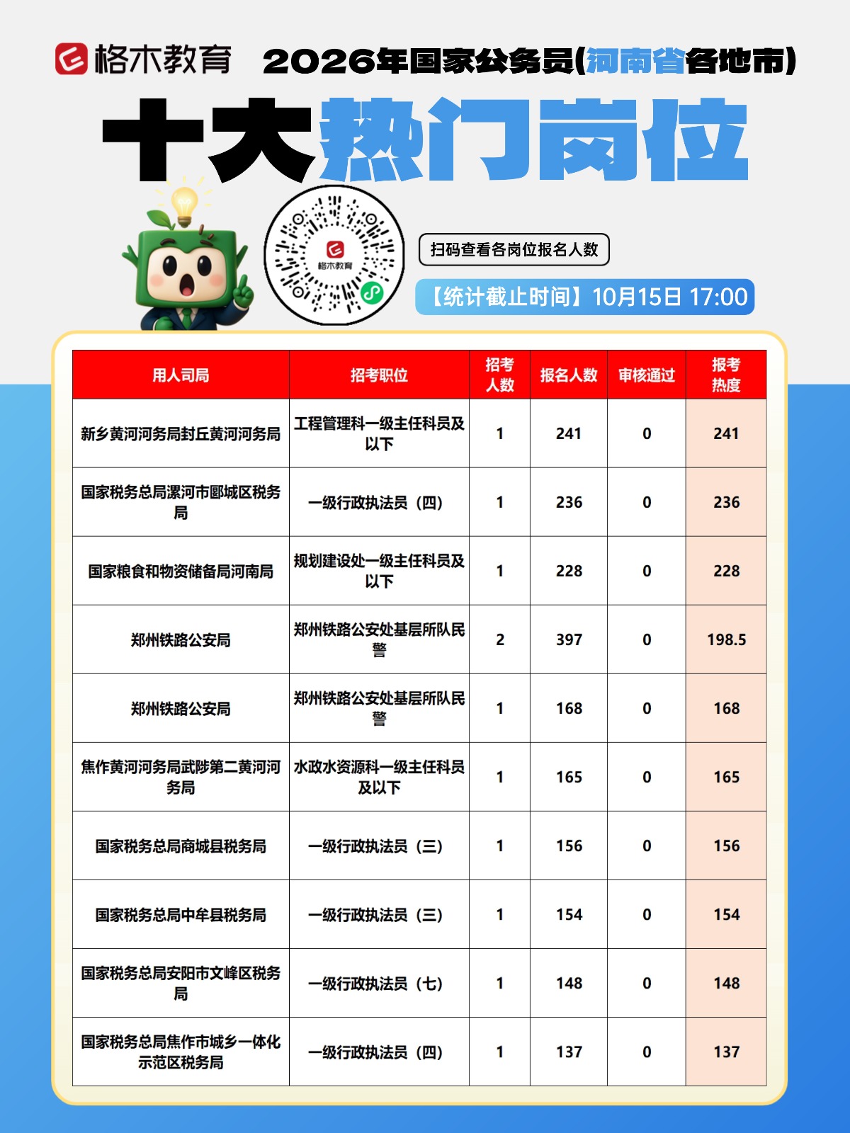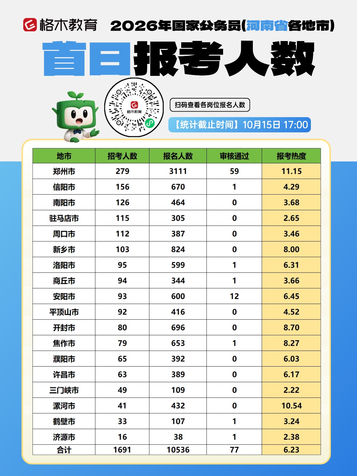 2026年国考首日报名人数统计:截至10月15日17时,河南招录1691人,报名人数10536人,审核通过77人。