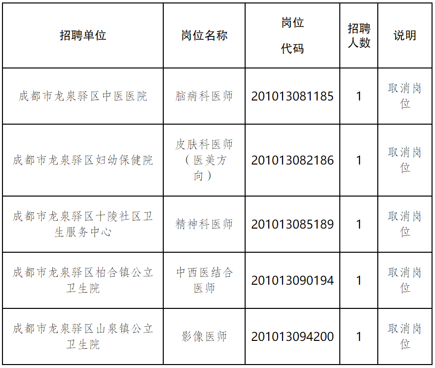 原文标题:成都市龙泉驿区卫生健康局 关于下属15家医疗卫生事业单位2025年下半年公开考试招聘工作人员部分岗位取消情况的公告