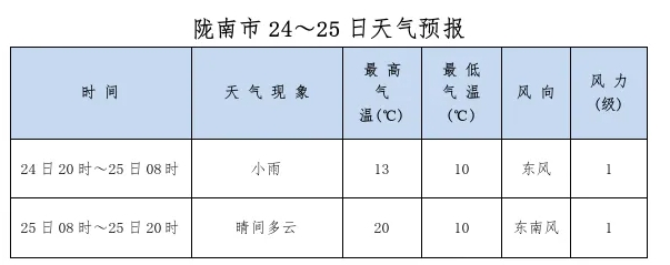 (二)请考生随时关注气象部门的天气预报,合理选择出行路线和出行方式,做好时间安排,注意交通安全,确保顺利参加考试。根据最新资料分析,考试期间(10月24~25日)天气预报:24日陇南市小雨,最低气温10℃左右,最高气温13℃左右,25日多云,最低气温10℃左右,最高气温20℃左右。具体预报见下表: