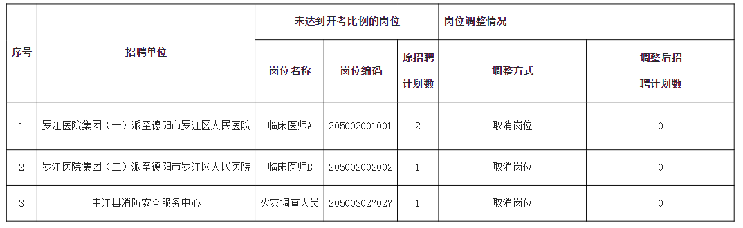 按照《德阳市人力资源和社会保障局 关于2025年下半年德阳市事业单位公开考试招聘工作人员的公告》相关规定和考生报名缴费情况,以下岗位因有效应聘人数与招聘人数之比未达到公告规定的笔试开考比例,现将取消部分岗位名额情况进行公告: