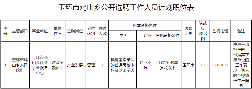 1.玉环市鸡山乡公开选聘工作人员计划职位表