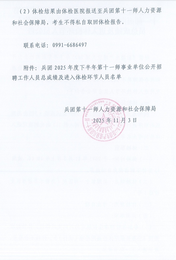 原文标题:关于新疆生产建设兵团2025年度下半年第十一师面向社会公开招聘事业单位工作人员总成绩及进入体检环节人员公告
