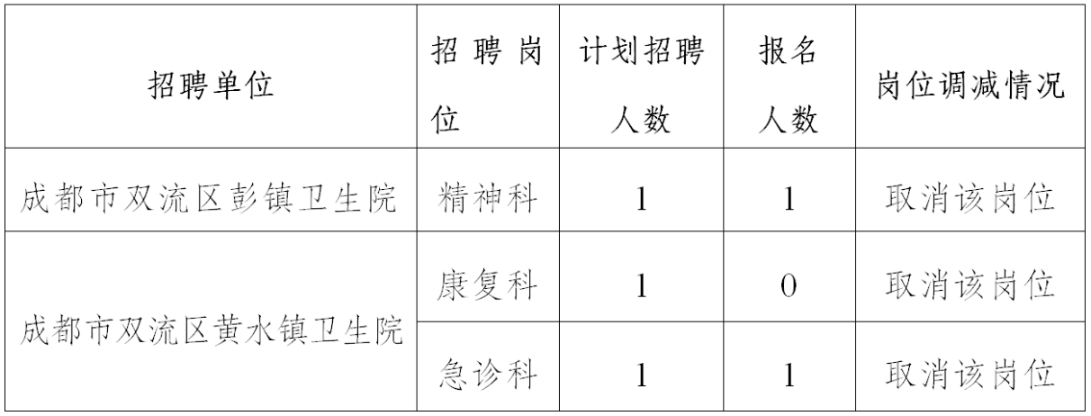 成都市双流区卫生健康局2025年“蓉漂人才荟”事业单位赴 外公招报名已结束,因个别岗位报名人数与拟招聘人数之比未达到 3:1,按照公告规定,经研究决定取消以下3个招聘岗位。