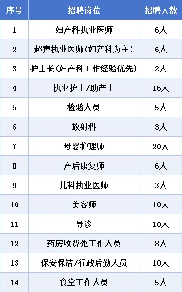 新的妇产院区即将投入使用,现面向社会招聘若干名专业技术人员。 岗位具体信息如下: