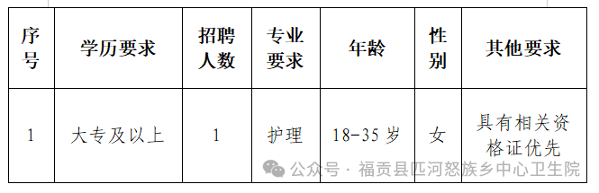 为进一步加强福贡县匹河怒族乡中心卫生院专业技术人才队伍建设,满足医院业务发展需要,提高服务能力,促进医院可持续发展。现面向社会公开招聘编外人员 1 名。有关招聘事宜公告如下: