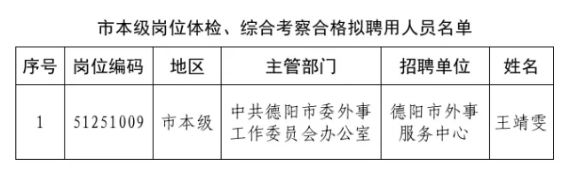 根据本次公招公告,经过资格审查、面试、体检、综合考察等程序,德阳市市本级岗位王靖雯(名单附后)体检、综合考察合格,拟办理聘用手续,现予公示。