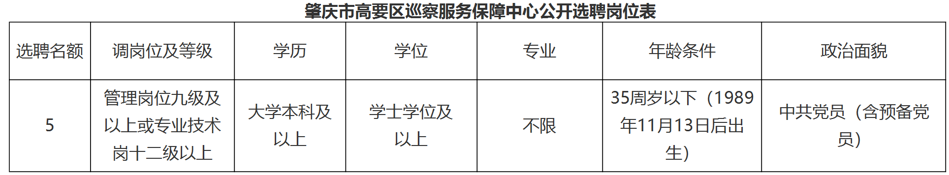 本次公开选聘岗位名额5个,选聘对象为肇庆市范围内聘用在管理岗或专业技术岗的公益一类事业单位人员。具体岗位要求见下表。