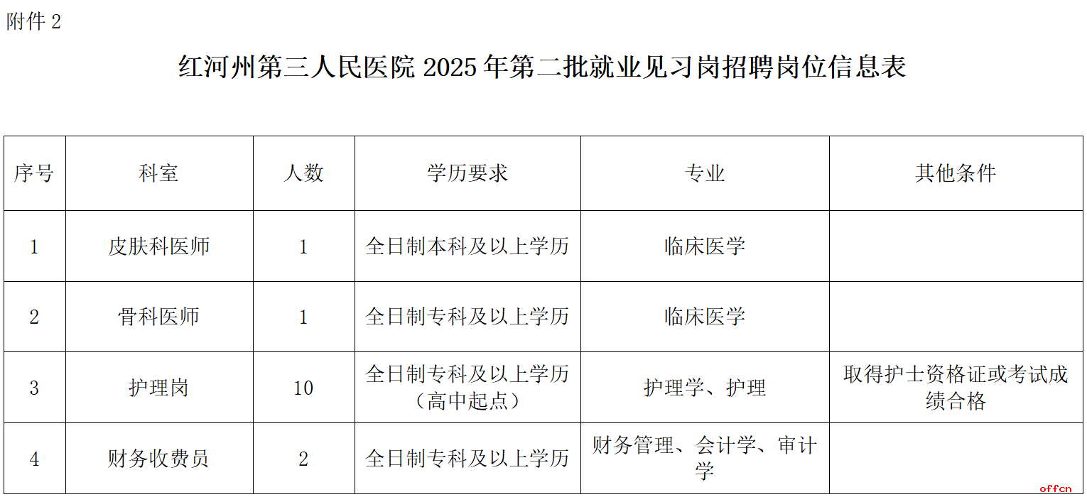 详见附件2:红河州第三人民医院2025年第二批就业见习岗招聘岗位信息表