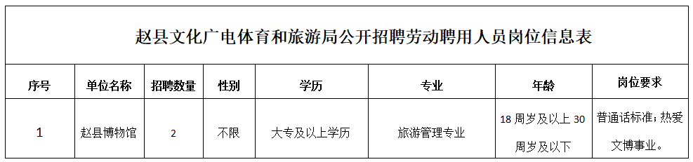 计划招聘劳动聘用人员2名。具体招聘人数、岗位、资格条件等,详见《赵县文化广电体育和旅游局公开招聘劳动聘用人员岗位信息表》(附件1)。