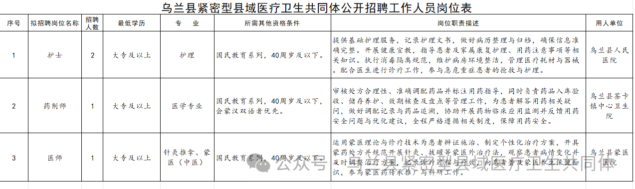 原文标题:乌兰县紧密型县域医疗卫生共同体面向社会公开招聘工作人员的公告