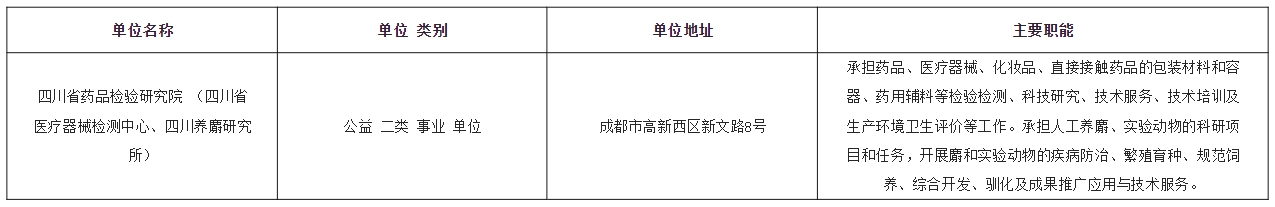 根据《事业单位人事管理条例》《事业单位公开招聘人员暂行规定》和《四川省事业单位公开招聘工作人员实施办法》等有关规定,四川省药品监督管理局(以下简称省药监局)面向全国公开考核招聘部分工作人员补充至四川省药品检验研究院(四川省医疗器械检测中心、四川养麝研究所)工作。现将公开考核招聘有关事项公告如下。