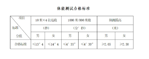 体能测试内容为三项:10米×4往返跑、男子1000米跑(女子800米跑)、纵跳摸高;体能测试各项合格标准详见(附件5).体能测试各单项均合格人员进入笔试环节,其他人员自动淘汰。