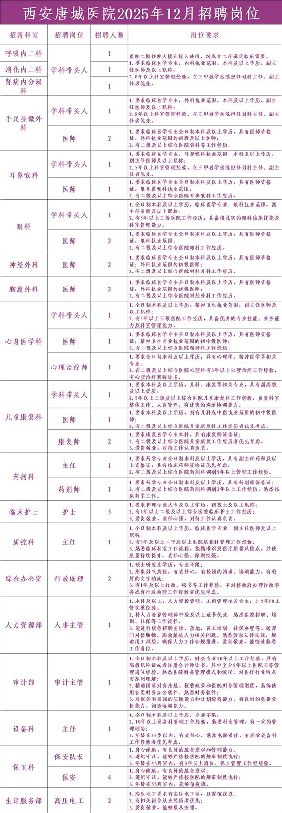 公务员考试网为各位考生带来:2025年12月西安唐城医院招聘公告(42人)。 考生还可以关注本栏目了解更多全国医院招聘考试精彩内容。