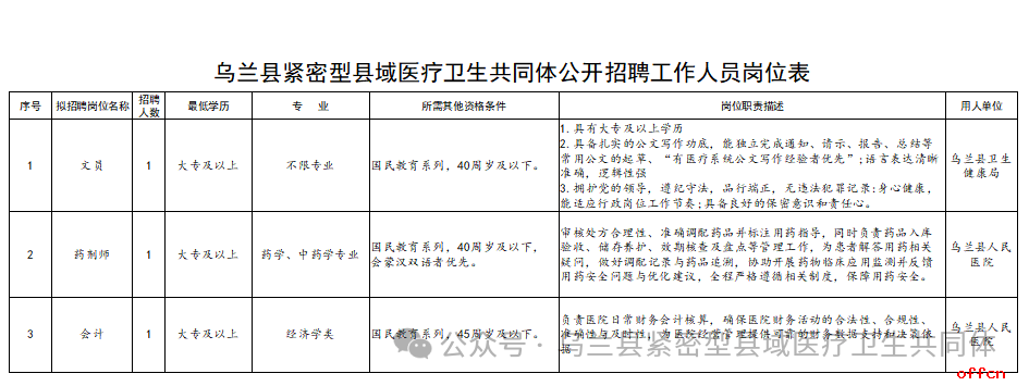 本次招聘由乌兰县紧密型县域医疗卫生共同体办公室进行统一招聘,招聘后人员按照《乌兰县紧密型县域医疗卫生共同体公开招聘工作人员岗位表》(以下简称《岗位表》进行分配,招聘岗位、人数和相关要求详见《岗位表》。