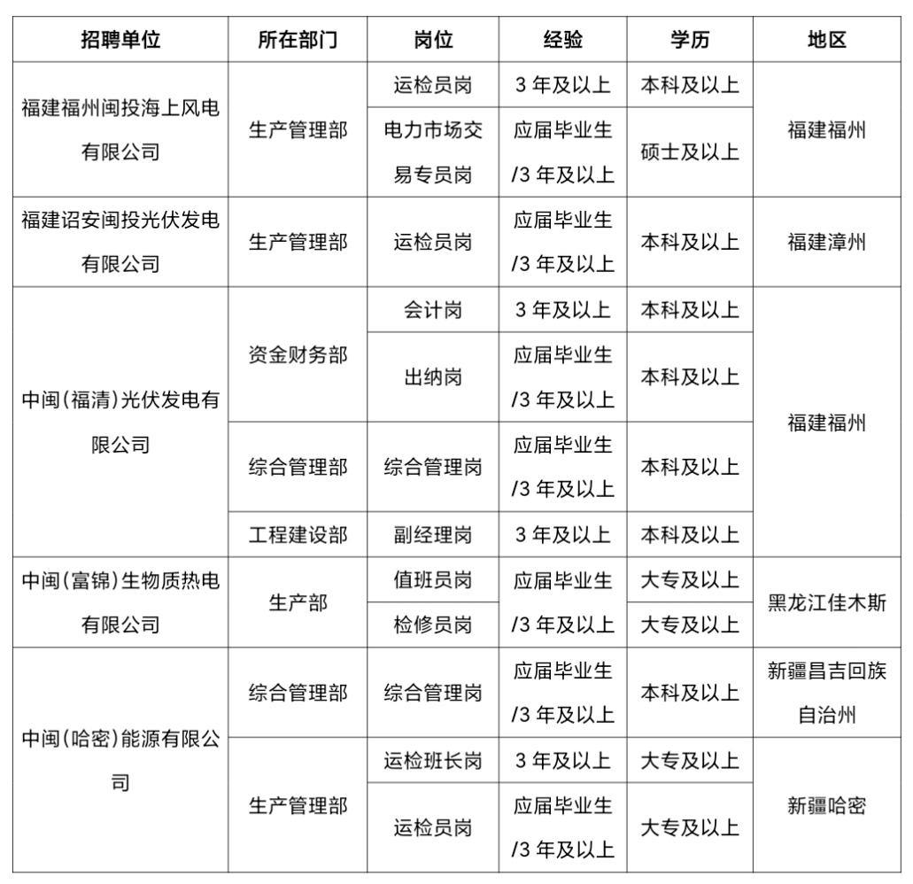 因公司下属福建福州闽投海上风电有限公司、福建诏安闽投光伏发电有限公司、中闽(福清)光伏发电有限公司、中闽(富锦)生物质热电有限公司、中闽(哈密)能源有限公司工作需要,现公开招聘以下岗位: