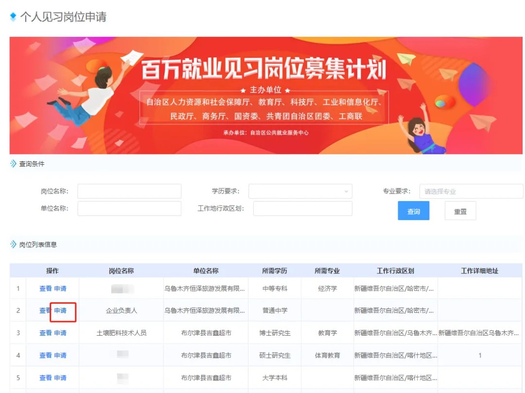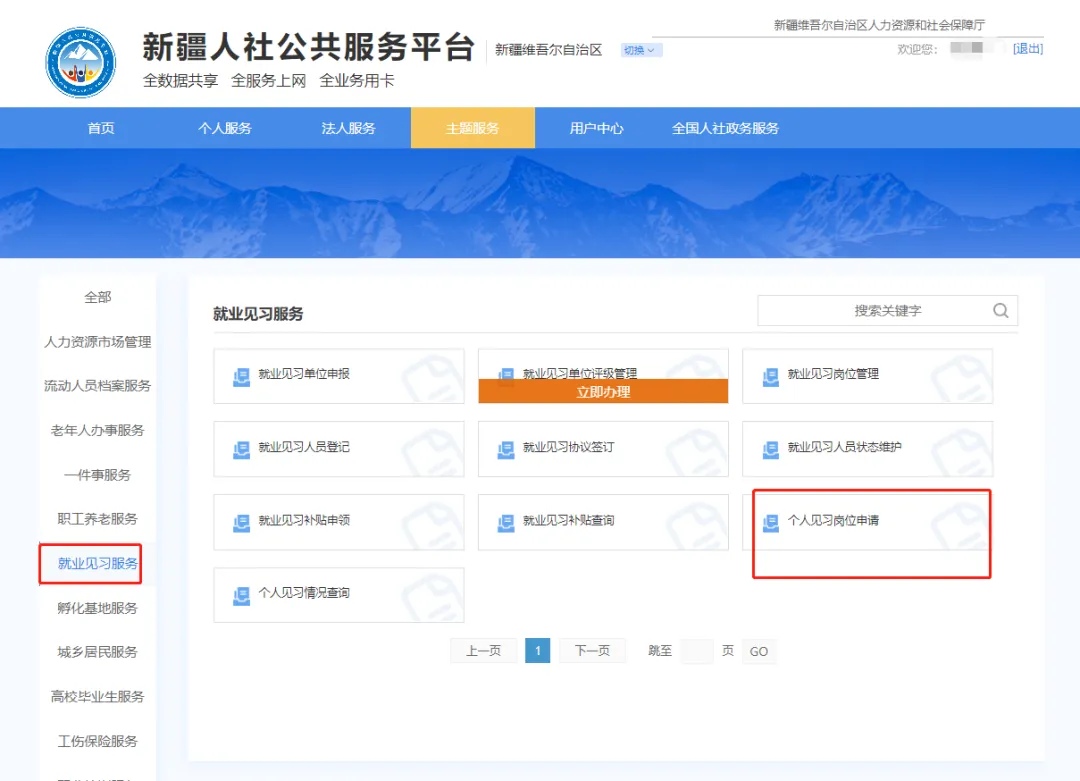 功能入口:主题服务-就业见习服务-个人见习岗位申请,办理业务:见习生申请见习。