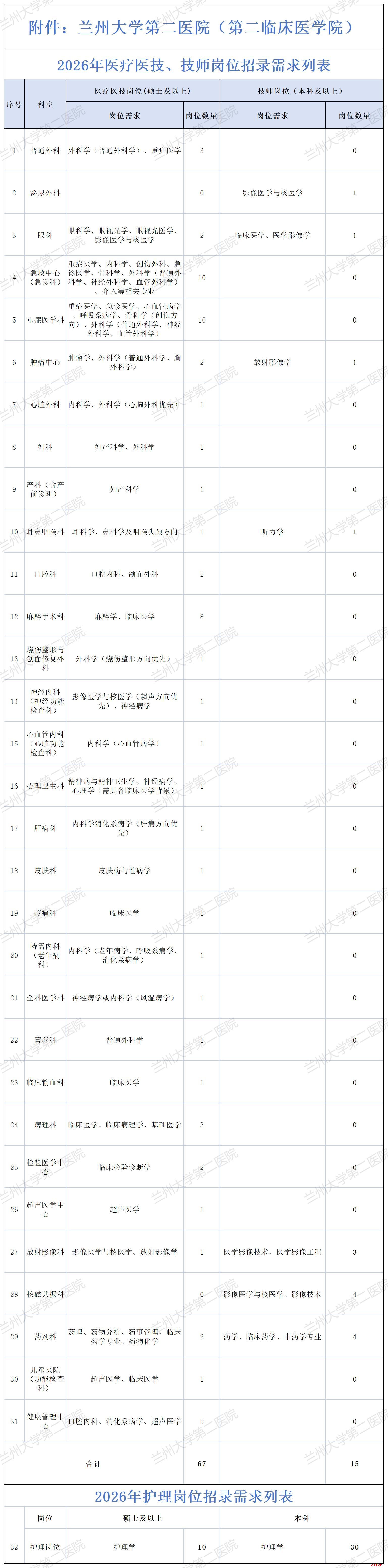 原文标题:兰州大学第二医院(第二临床医学院)2026年医疗医技、技师及护理岗位招聘启事(第二批)