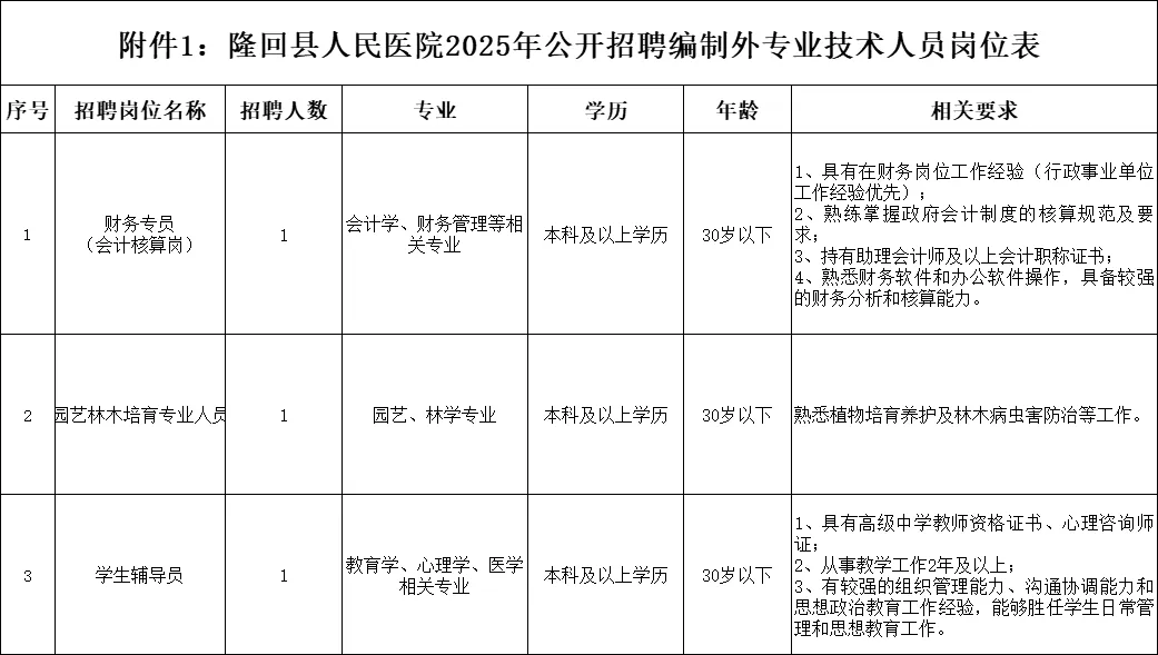 此次共公开招聘岗位3个,招聘计划3名(其中财务专业人员1名、园艺林木培育专业人员1名、学生辅导员1名),具体要求详见《隆回县人民医院2025年公开招聘编外合同制专业技术人员岗位表》(见附件1)。