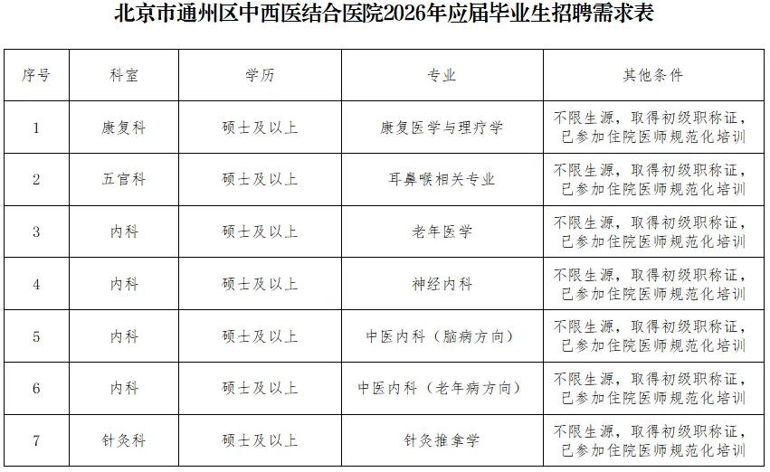 原文标题:招聘丨北京市通州区中西医结合医院2026年毕业生招聘公告