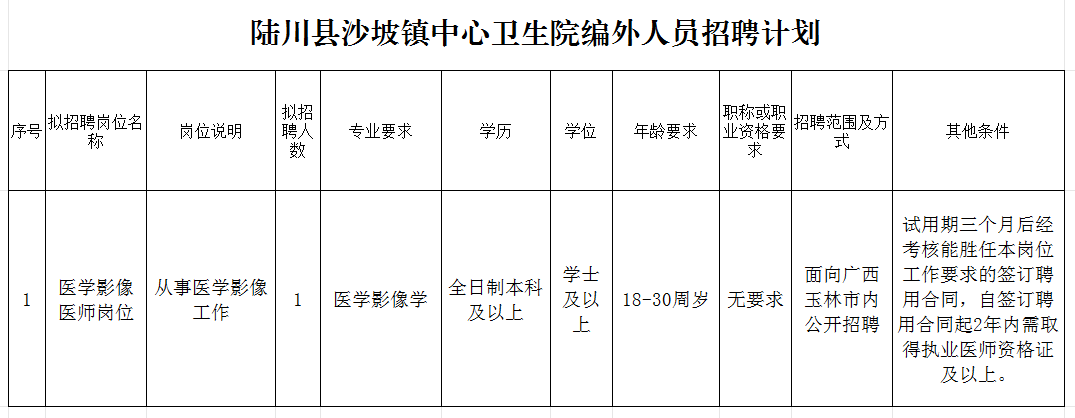 原文标题:陆川县沙坡镇中心卫生院公开招聘编外工作人员公告