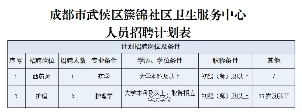 原文标题:【招聘公告】成都市武侯区簇锦社区卫生服务中心社会招聘编外专业技术人员