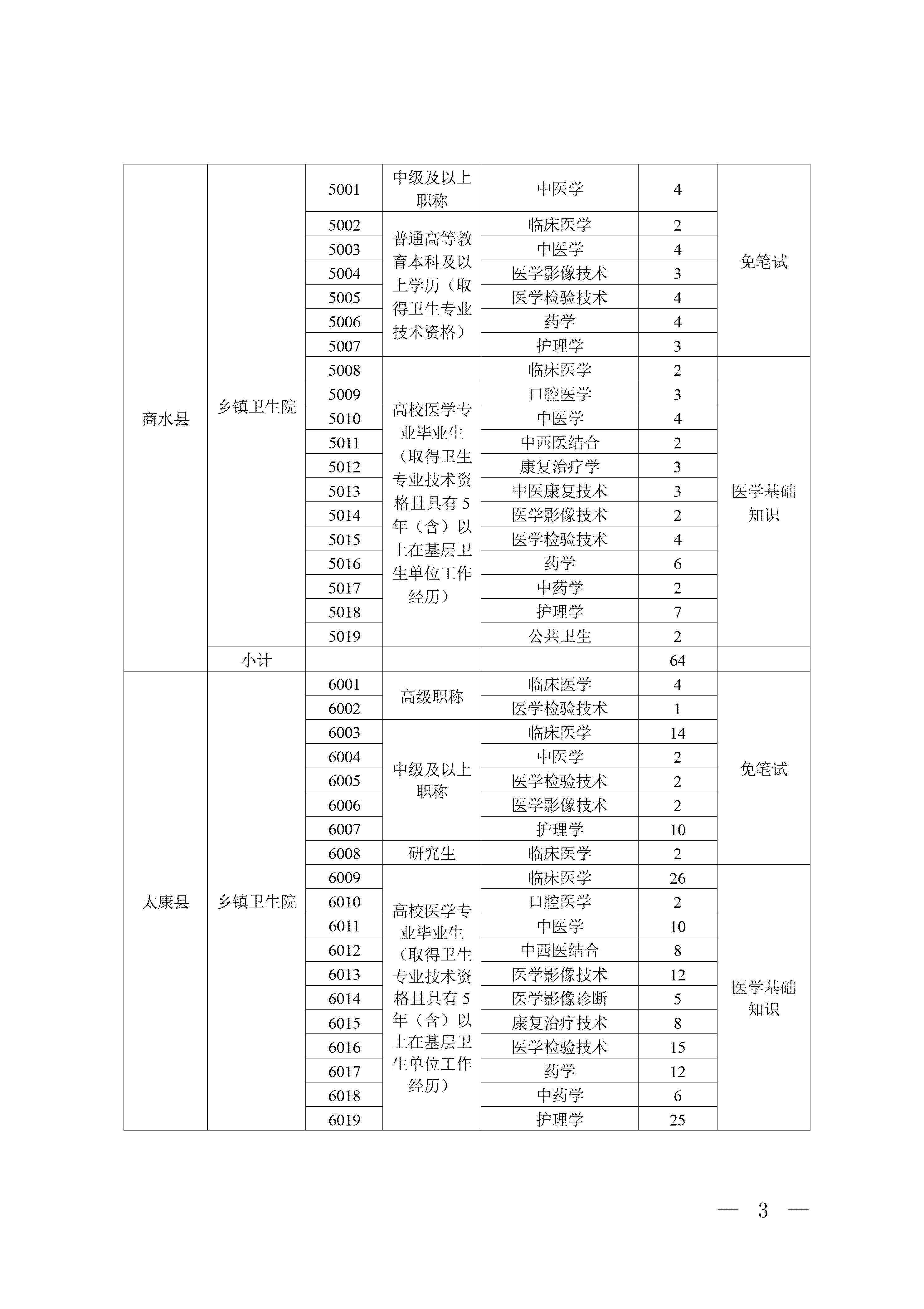 全市计划拟招聘984名专业技术人员到乡镇卫生院(不含社区卫生服务中心,下同)工作。招聘专业涵盖临床医学、口腔医学、中医学、中西医结合、护理、药学、医学技术、公共卫生等。各县(市、区)具体招聘岗位及要求详见附件1。