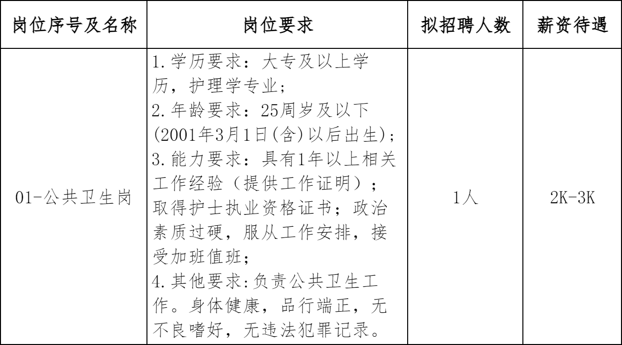 此次聘用人员为临聘人员,其试用期管理、社会保险待遇、薪资待遇参照井冈山市柏露乡卫生院现有标准执行。