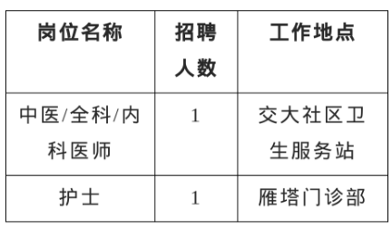 根据工作需要,西安交通大学医院(以下简称“校医院”)现公开招聘医师、护理人员各1名,以部门自聘方式,具体聘用办法和待遇按照医院相关规定执行。