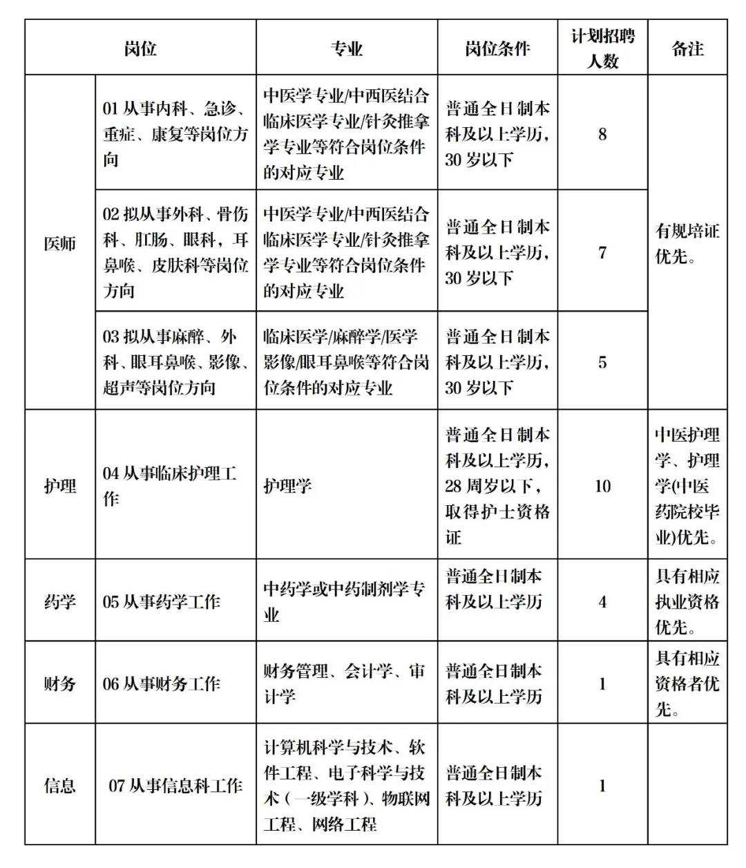 注:硕士研究生,主治医师年龄在35周岁以下,有规培证,不限专业,不限名额,可随时应聘。