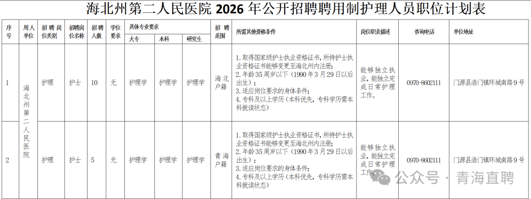 1.海北州第二人民医院2026年公开招聘聘用制护理人员职位计划表