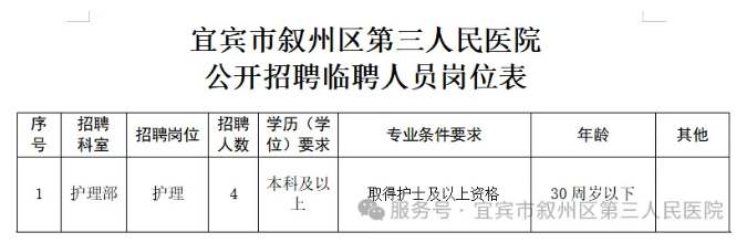 原文标题:宜宾市叙州区第三人民医院公开招聘临聘工作人员公告