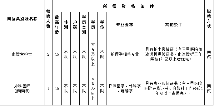 1.年龄在18周岁以上,45周岁以下(具有中级及以上专业技术职称的人员可适当放宽)。2.具备应聘岗位所需的专业、大专及以上学历,以及所聘岗位的其他条件。3.取得硕士研究生及以上的卫生技术人员或取得卫生技术专业资格证书的人员同等条件下可优先聘用。4.身体健康(通过面试考核者为体检对象,体检标准及程序参照公务员录用体检特殊标准(试行)提交体检报告,本院的体检报告亦可)。5.遵守宪法和法律,具备良好的品行和职业道德。