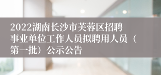 长沙市芙蓉区2022年公开招聘事业单位工作人员笔试、面试、体检工作已经完成,部分考生已完成考察工作,根据《长沙市芙蓉区2022年公开招聘事业单位工作人员简章》的规定,现将拟聘用人员名单(第一批)予以公示(公示期为7个工作日,名单附后)。