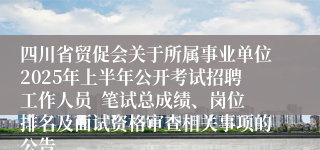 根据《四川省贸促会关于所属事业单位2025年上半年公开考试招聘工作人员公告》(以下简称“公告”)规定,现将笔试总成绩(含加分)、岗位排名及面试资格审查等有关事项公告如下: