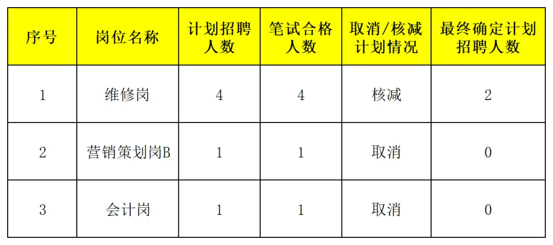 因部分岗位考生笔试合格人数未达到规定比例,根据招聘简章要求,现将岗位核减及取消情况公布如下: