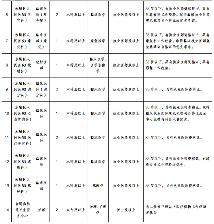 (1)水城区人民医院招聘人员年龄35岁及以下,取得中级职称人员年龄放宽到40岁及以下。取得副高级职称人员年龄放宽到45岁及以下。取得正高级职称人员年龄放宽到50岁及以下。
