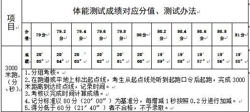 1.体能测试:体能测试主要考查应试者是否具备从事扑火工作的身体条件,考试科目为3000米跑,现场打分,现场公布成绩。体能测试合格者进入面试环节,体能测试低于60分者不合格,不予录取,具体对应分值如下: