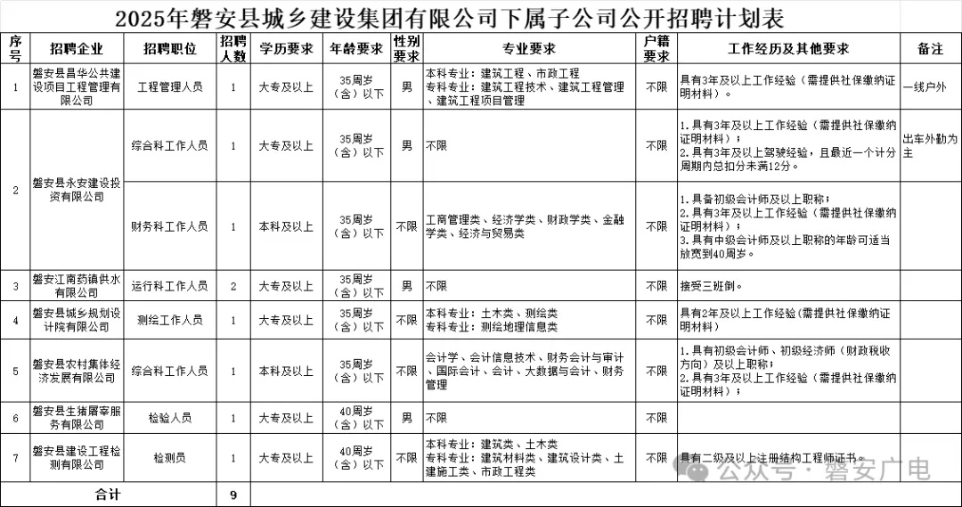 2.2025年磐安县城乡建设集团有限公司下属子公司公开招聘计划表