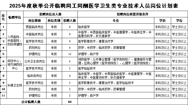 计划公开临聘同工同酬医学卫生类专业技术人员60名(基本条件)。基本条件人员岗位详见《定边县2025年秋季公开临聘同工同酬医学卫生类专业技术人员岗位计划表》。