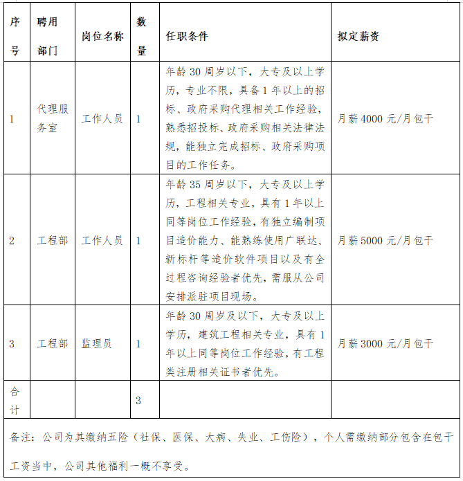 吉安城投建设监理有限公司于2020年7月注册成立,隶属吉安市城投公司二级子公司,公司注册资本1000万元人民币,为专业资质乙级工程监理企业(房建+市政)。经营范围许可项目为工程建设监理业务、工程造价咨询业务、政府采购代理服务。因项目工作需要,经公司研究,决定面向社会招聘临时用工3人,现将有关事项公告如下: