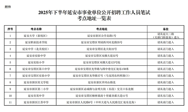 2025年下半年延安市事业单位公开招聘工作人员笔试定于2025年9月27日(星期六)上午8:30-12:00进行。为方便应聘人员顺利参加考试,现就有关事项提示如下: