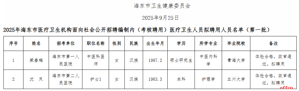 原文标题:2025年海东市医疗卫生机构面向社会公开招聘编制内(考核聘用岗位)医疗卫生人员拟聘用人员公示(第一批)